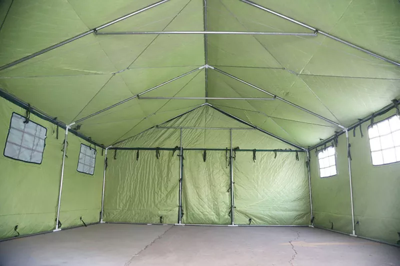 5×6м курулуш чатырынын стандарттуу конфигурациясы эки эшик жана алты терезени камтыйт, бул персоналдын кирүүсүнө, табигый жарыктандырууга жана абанын айлануусуна шарт түзөт. Терезелер сетка үлгүсүндөгү түзүлүштү кабыл алат көз карандысыз пардалар менен, функционалдык муктаждыктарга ылайык райондоштурулган башкарууга мүмкүндүк берет.